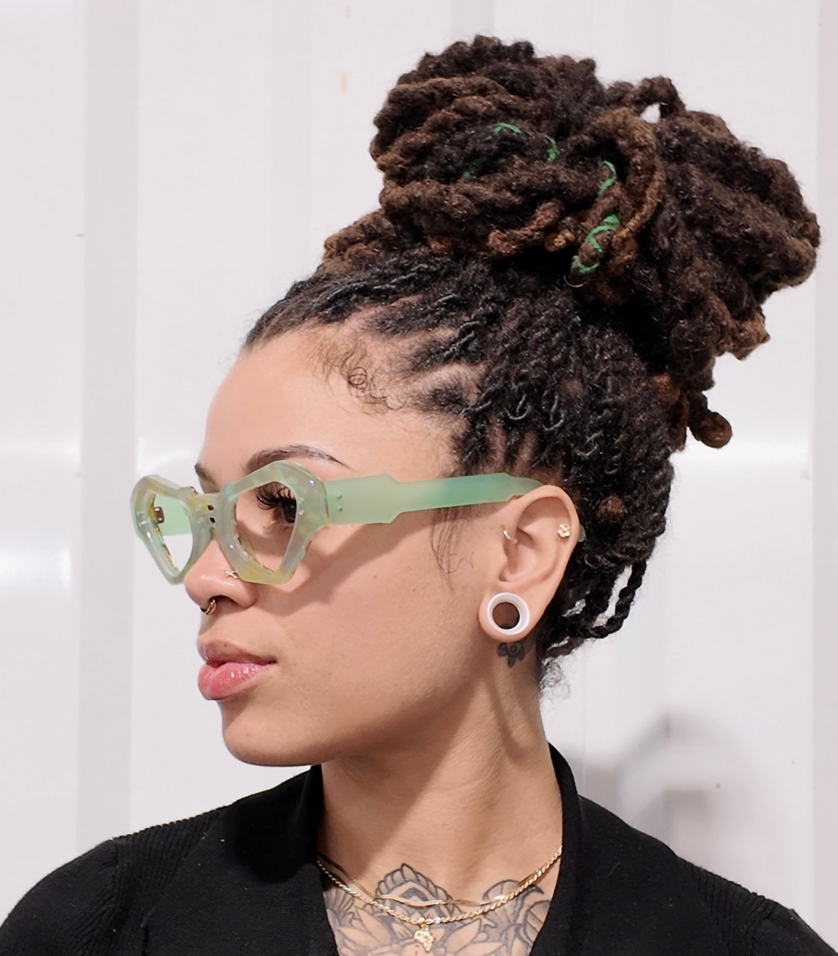 The Sc3 Mint features a mid-size Cateye frame adorned with vibrant green prints, complemented by a sophisticated golden Havana inlay on the inside. With precise measurements of 49-22-145, this design balances style and comfort expertly. Ideal for those seeking a distinctive yet refined look, the frame’s shape enhances facial contours while the quality materials ensure durability and a premium feel. Perfect for everyday wear, the Sc3 Mint combines classic elegance with a modern twist.